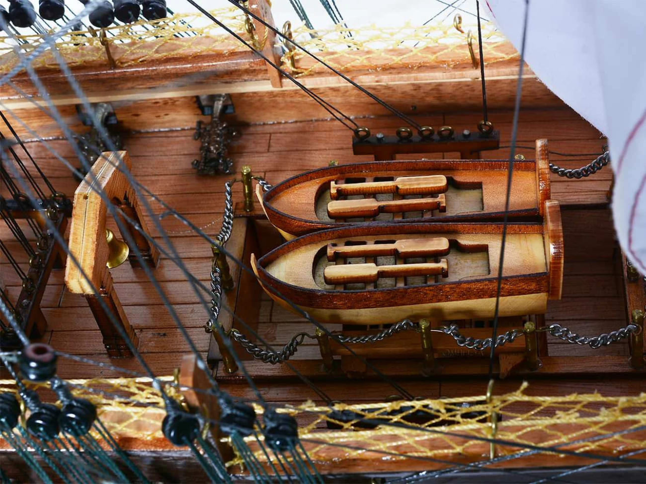 甲板上有逼真的帶肋骨木製救生艇,擬真金屬大砲、金屬方向舵、金屬鈴鐺、船長用餐和睡眠艙,以及許多其他手工製作的裝飾品。該模型完美矗立於實木底座上並有黃銅銘牌標示。
